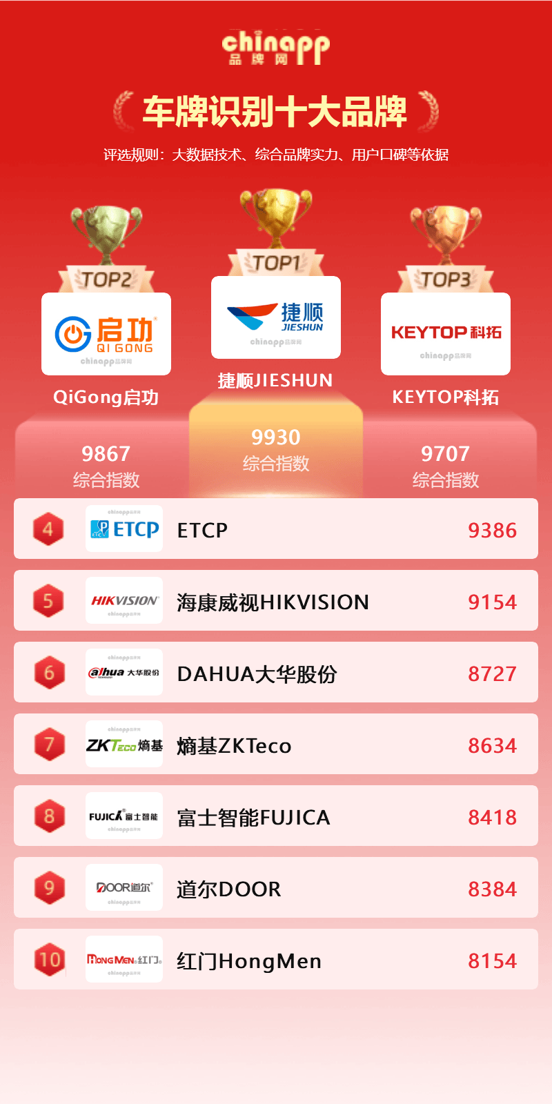 榜单说明:车牌识别十大品牌排名数据是由品牌网chinapp品牌数据研究部门通过收集整理车牌识别品牌资料,品牌网chinapp基于大数据统计、人为根据车牌识别市场及参数条件变化的分析研究专业测评而得出的车牌识别十大品牌排行榜,是大数据、云计算、数据统计真实客观呈现的排名结果。